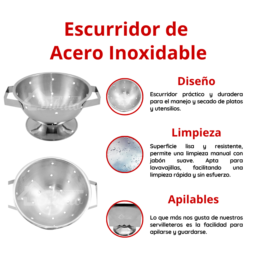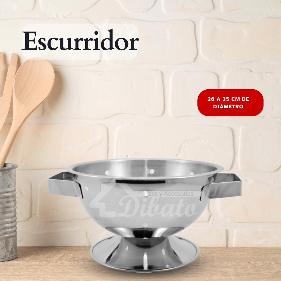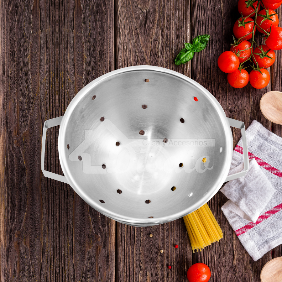 El Escurridor de Acero Inoxidable es ideal para escurrir pasta, verduras y otros alimentos de manera rápida y eficiente. Resistente y fácil de limpiar, es una herramienta esencial en cualquier cocina.